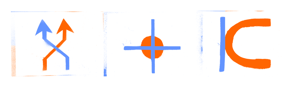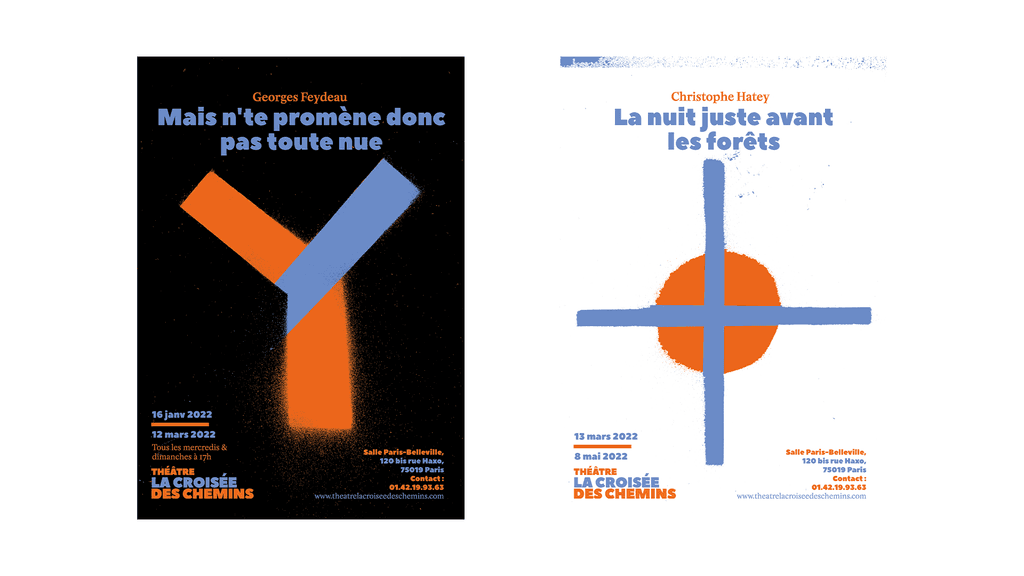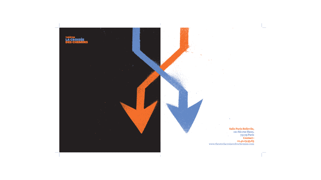Logo et charte graphique, flyer et programme, tickets d’entrée et affiches de pièce // Nous avons réuni des signes qui reprensantaient le croisement et à l’aide de pochoirs nous les avons fait à la bombe aérosols afin d ‘en faire notre principe graphique